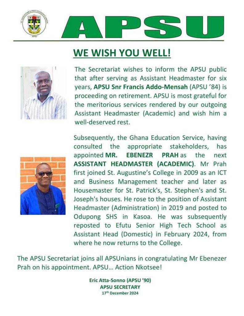 The appointment of Mr. Prah symbolizes a continued commitment to academic and leadership excellence at St. Augustine’s College. The APSU Secretariat acknowledges this smooth transition and expresses confidence in his ability to lead the college to new heights. This milestone serves as a reminder of the enduring legacy of APSU members in shaping not just St. Augustine’s College but the broader educational landscape of Ghana.